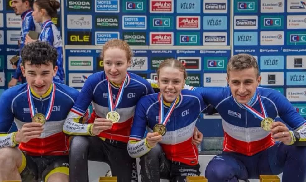 Le week-end a débuté de la meilleure des manières pour l’équipe régionale. Alignée sur l’épreuve du relais des comités, la formation composée de Simon BILLET (CC Étupes), Zélie LAMBERT, Electa GALLEZOT (VC Ornans) et Fabien DOUBEY (SC Arinthod – Total Energies) a conservé son titre national, au terme d’un sprint serré. La sélection l’emporte devant les équipes Auvergne–Rhône-Alpes et Grand Est.