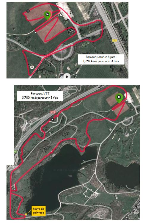 - Parcours : Course à pied : 1,750 km à parcourir 3 fois VTT : 3,700 km à parcourir 3 fois
